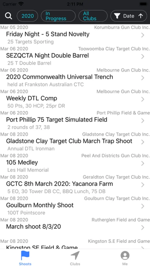 Once you have selected the shoot you are interested in you can view the events within that shoot, see who is leading for each event and review the complete scores for each competitor by best score or squad order. If you are viewing a currently in progress shoot you can "pull down to refresh" at any time to retrieve the latest scores.