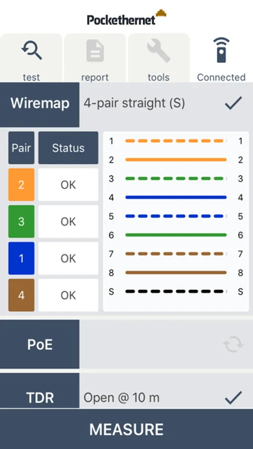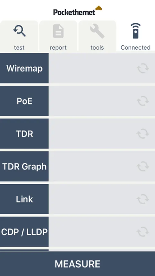 The app enables you to make measurements with the Pockethernet device, remote control every function and generate a report of your findings.