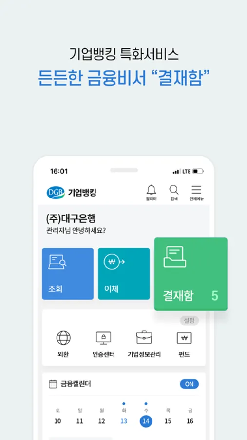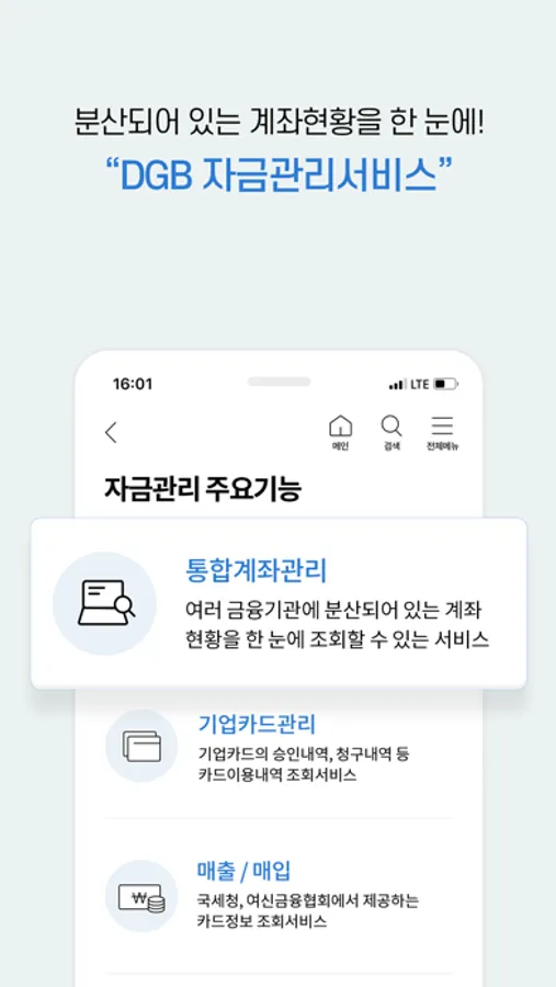 - 통합계좌관리, 기업카드 관리, 매출/매입 현황, 자금보고서