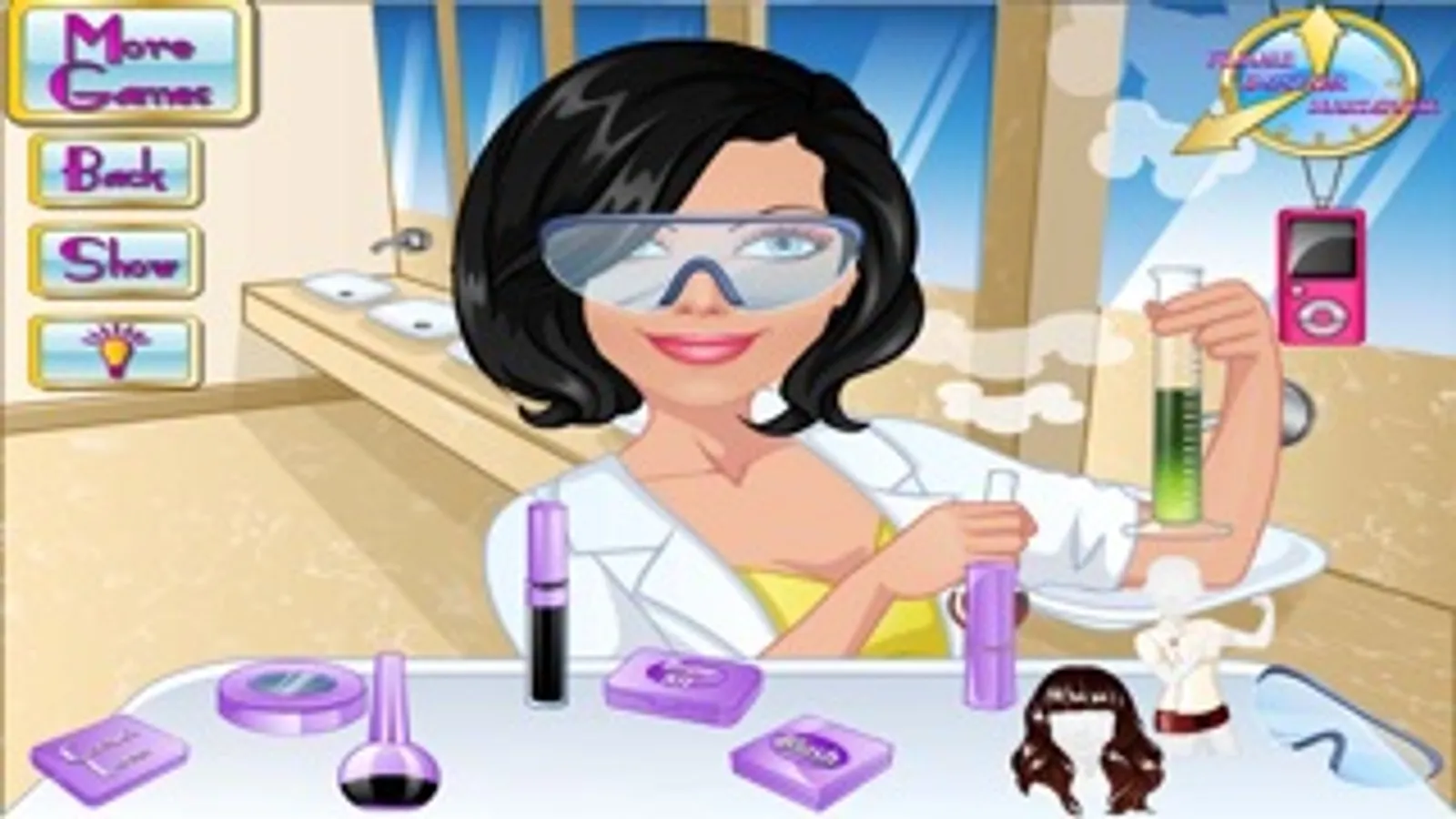 Give this scientist a quick but good makeover.this cute scientist is going to do some important research at the lab today but she's running a bit late! can you help her out so she can start her shift on time? first give her a short facial treatment. then select a stylish lab coat and some nice makeup.