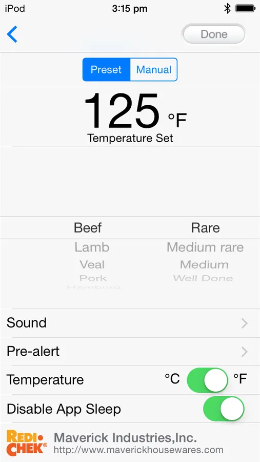 * Set the temperature for 16 different type of meats and 2 type of foods with pre-set selected temperatures.
