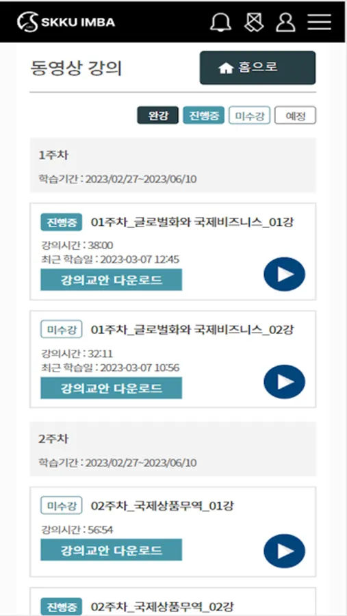 ▶ 나의 강의실 : 현재 수강중인 과목과 오프라인, 청강과목, 수강 완료 과목의 동영상 강의와 강의안을 보실 수 있습니다.