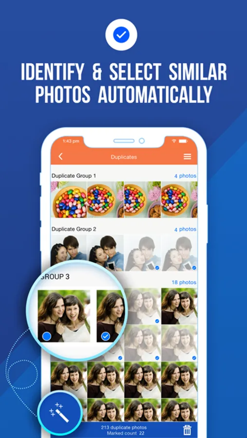 Duplicate Photos Fixer is an easy-to-use application to delete duplicate photos on iPhone. It runs a quick scan to search duplicate photos, including exact and similar-looking images. This duplicate photo finder automatically marks the duplicates and saves time. Remove duplicate photos from the iPhone using this amazing duplicate image finder.