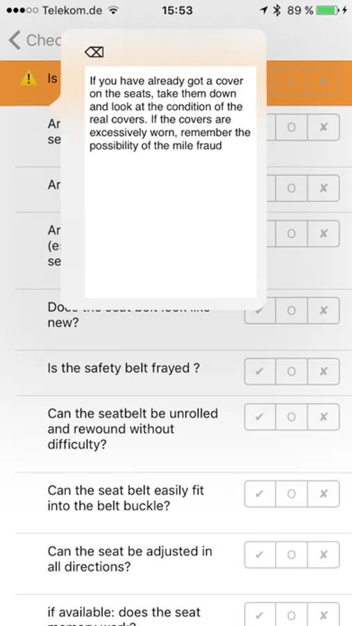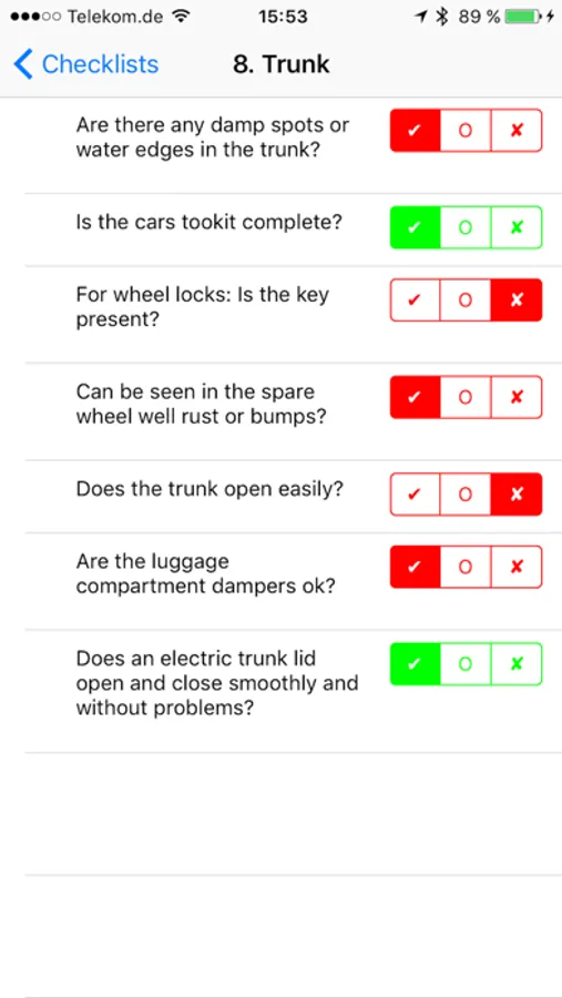 The questions are divided into 17 categories, from body, engine and chassis to the test drive. Various questions are also explained. For each category and for the entire vehicle, a visual assessment is created showing how many questions have been answered positively, negatively or not at all. Thus the condition of a vehicle results on a view.