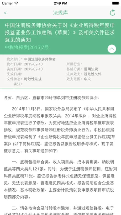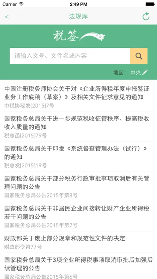2.智能搜索,可以随意输入法规文号、文件名或法规内容进行快速查询;