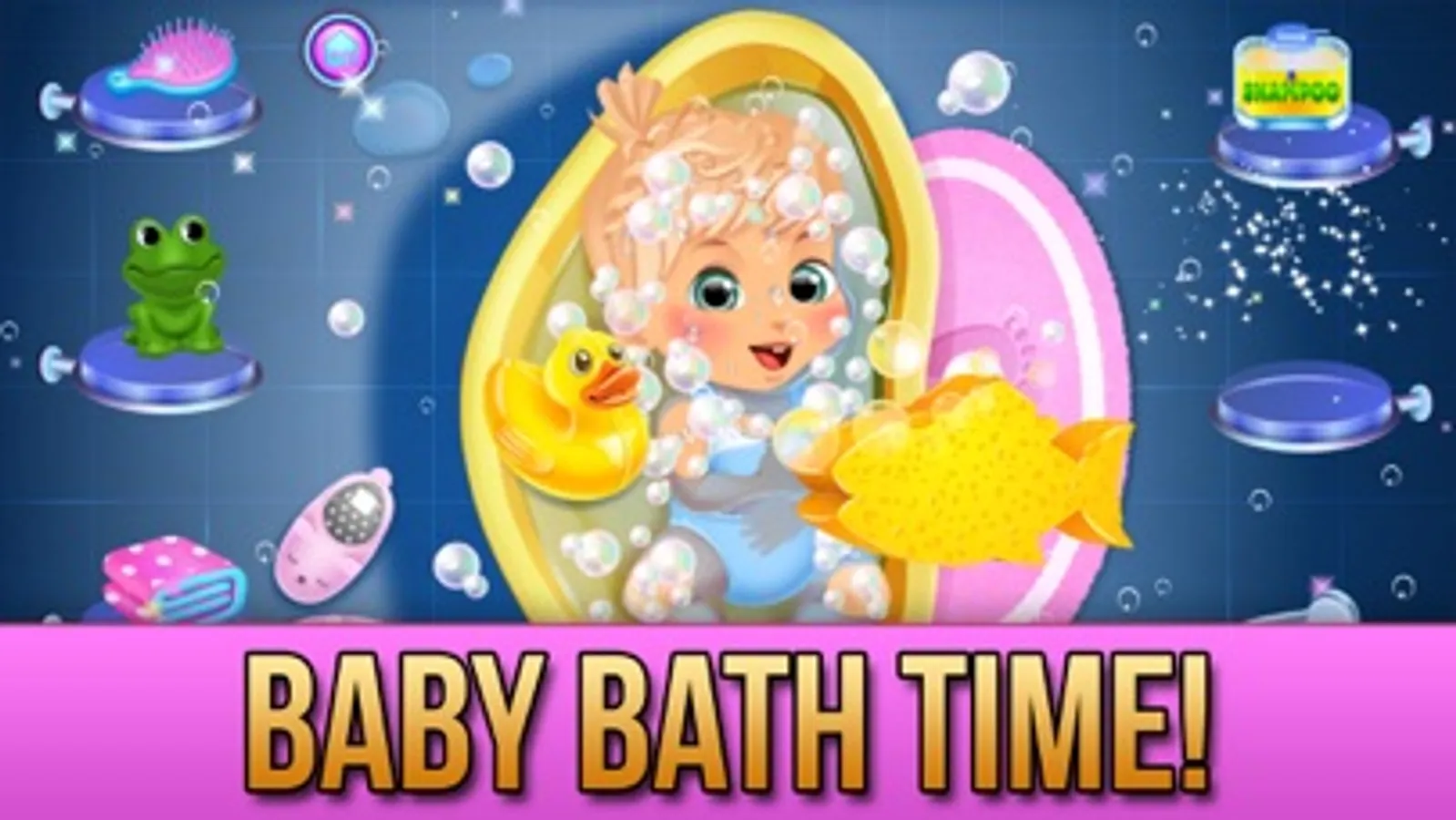 Level 10: Baby bath time. Care for the cute baby, play with bath toys like rubber ducky, froggy and clean-up!