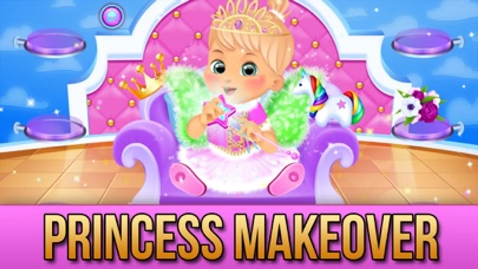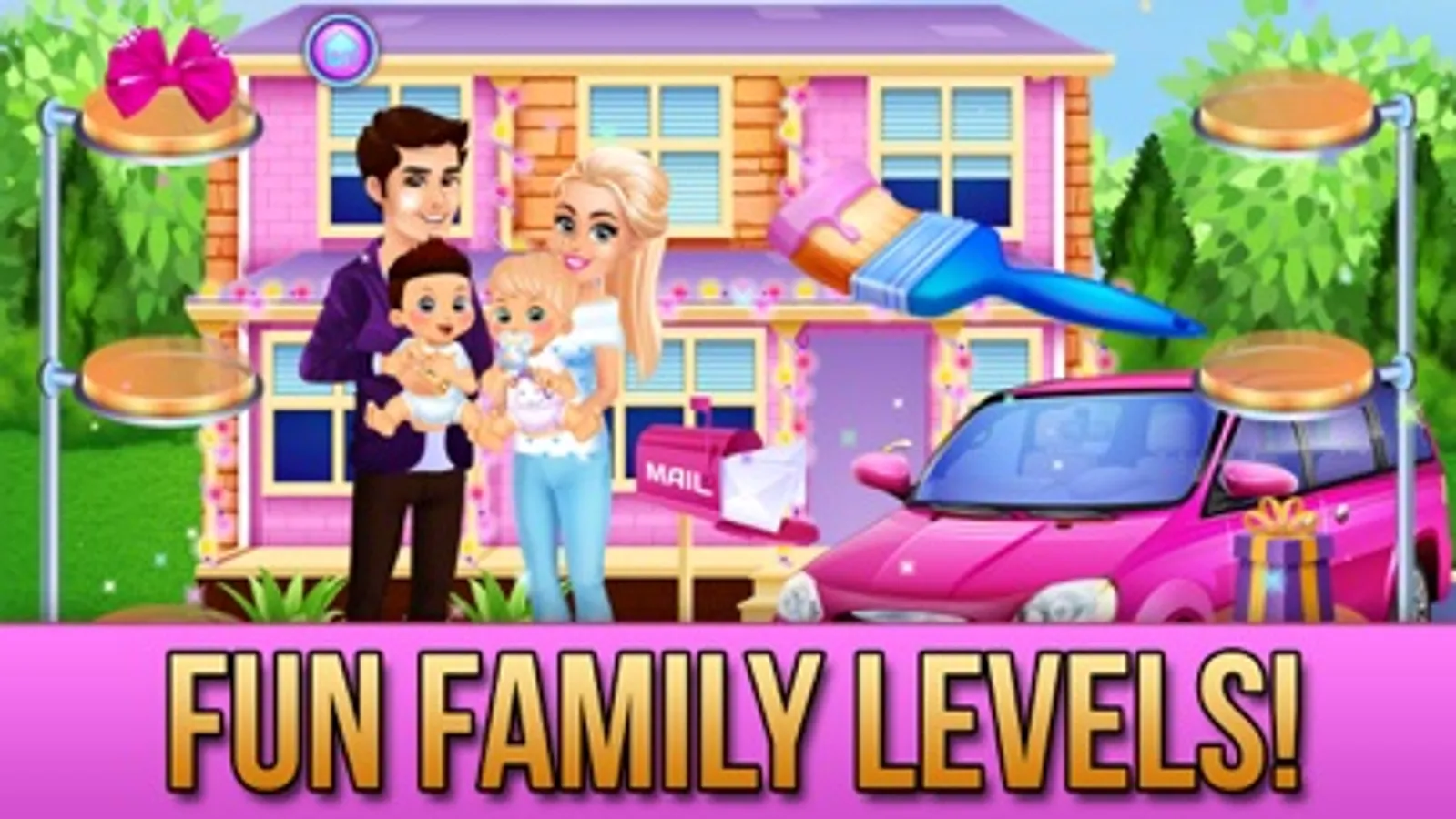 Level 14: Super fun baby play room! Let's play in the bouncer! Add sparkles, decorate & more with mommy, daddy and babies!! Hooray!