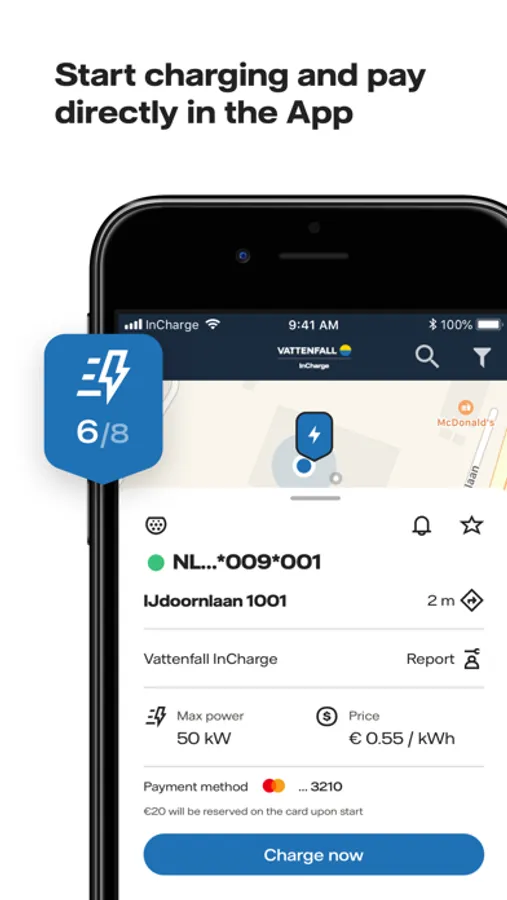 Register your credit card easily and securely in the app. You can then immediately start charging at all public charging points of InCharge. You do not have to be a InCharge customer for this and you will receive a proof of payment immediately after your charging session.