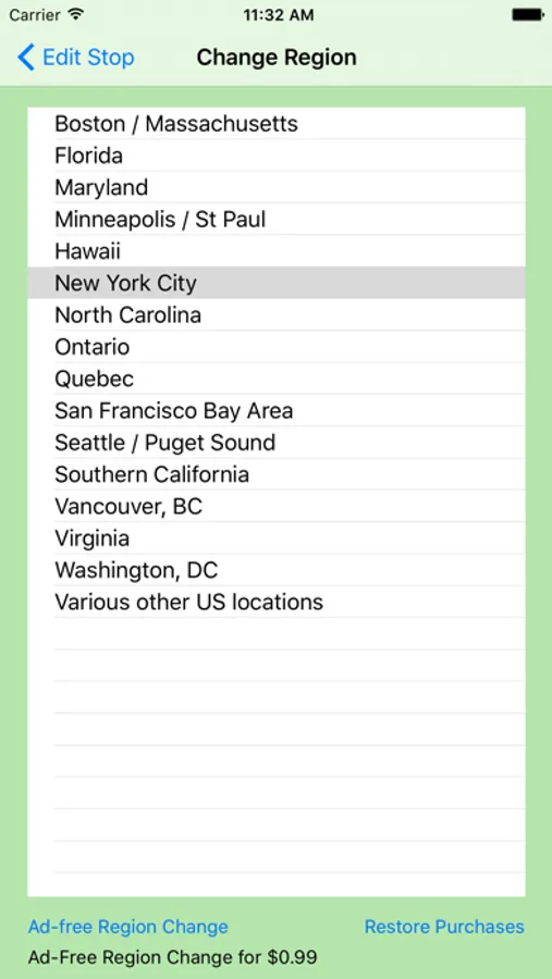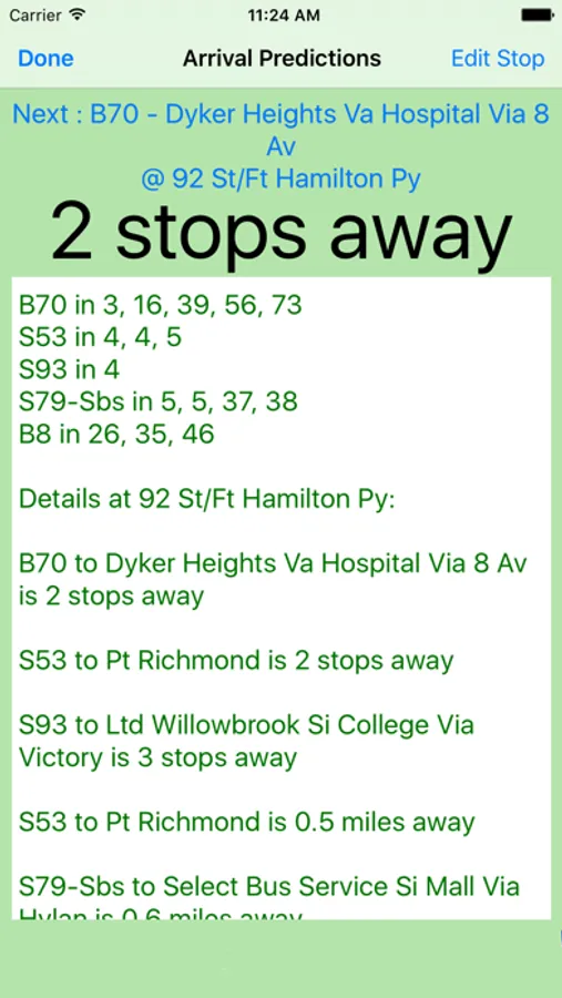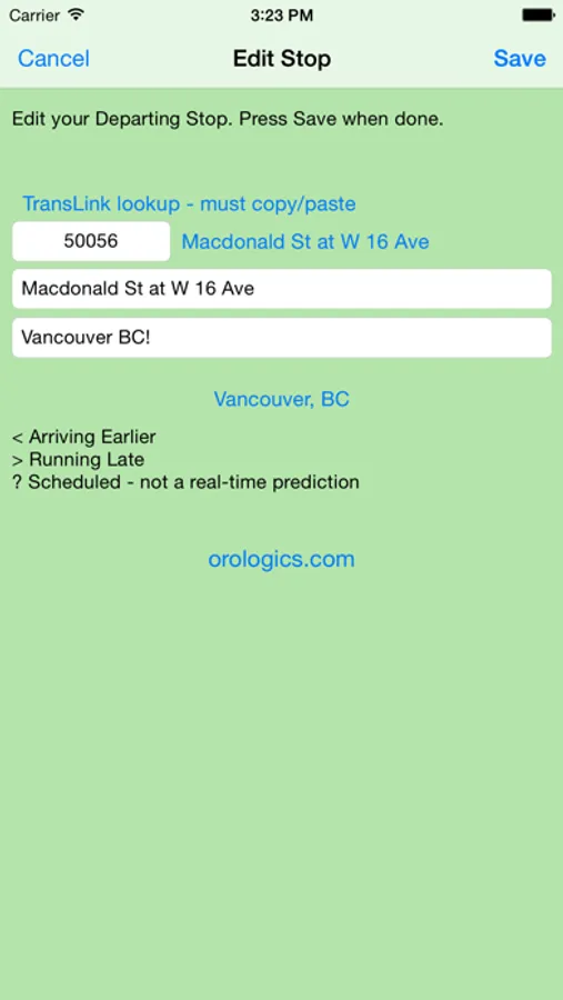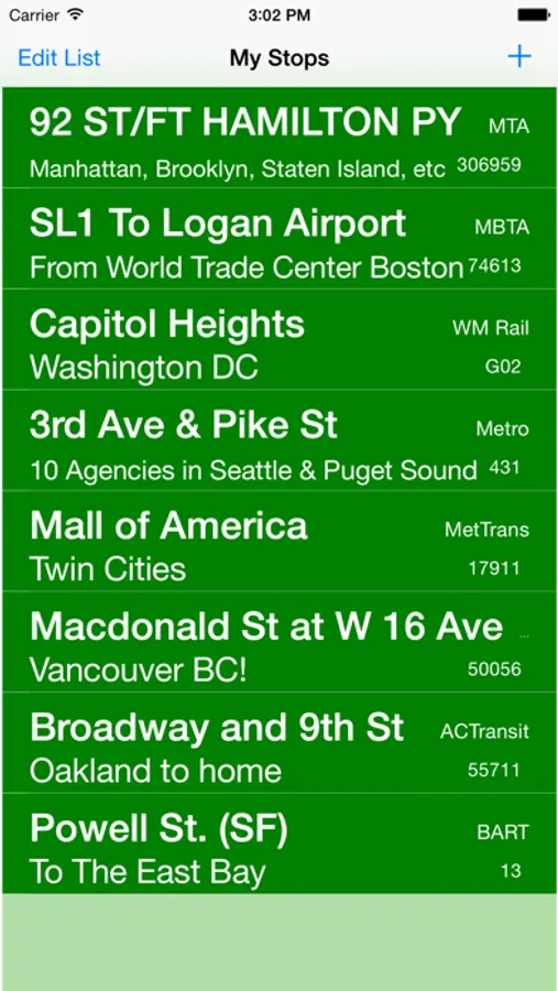 You define your frequently used stops on your phone by stop ID and name them for easy reference. Use Fast Lookup or the agency website with SmartPaste to find your departure stop in advance by route and the route's destination, or just check the sign at the stop. Website SmartPaste tells you when you've navigated to a single stop and grabs the stop number for you. After you've entered a stop ID, its location is displayed to the right. Tap it to auto-fill the stop title. The stop subtitle is a good place to remind yourself where you're going. For example, "To Work" or "From Work to Home". You can rearrange, modify or delete your stops so the ones you need most are at the top. Customize the text so it looks great on the Apple Watch.