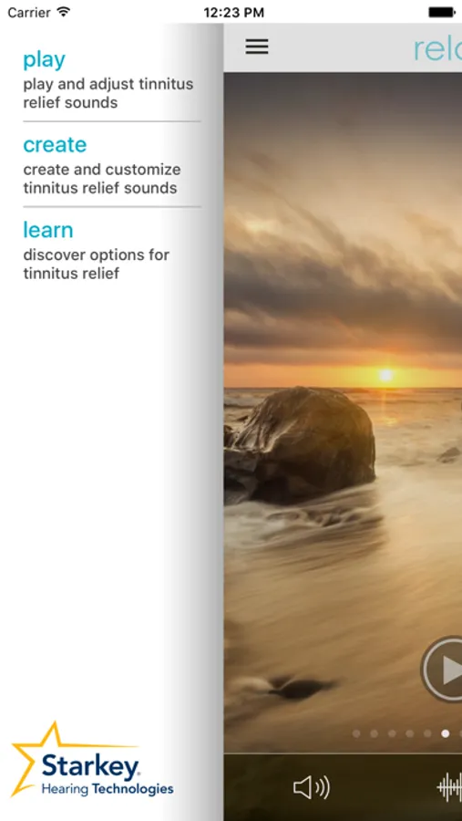 The Starkey Relax app is an informational resource and self-management tool, which is intended for incorporation into a hearing professional’s sound therapy protocol for patients diagnosed with tinnitus. Sound therapy uses sound to decrease the loudness or prominence of tinnitus.