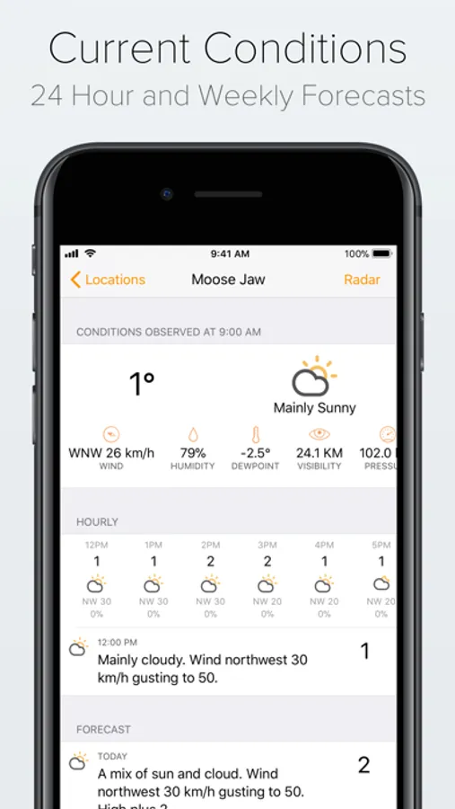 * Current conditions including wind, humidity dew point, visibility, pressure, sunrise and sunset.