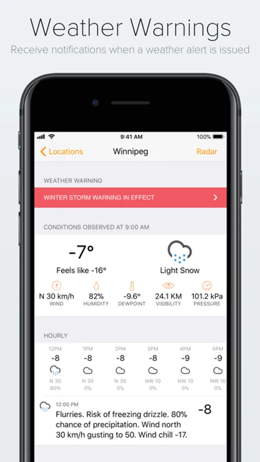 * Receive notifications for latest weather warnings when issued by Environment Canada.