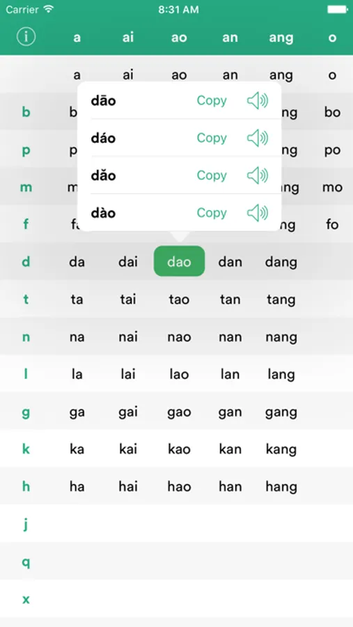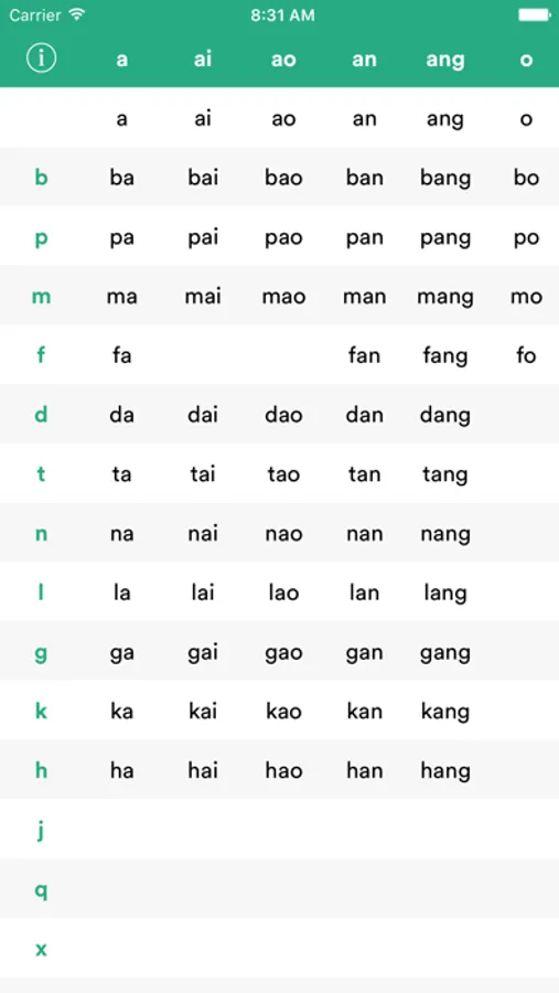 A complete list of all Hanyu Pinyin syllables (汉语拼音音节表) used in Standard Chinese. Each syllable in a cell is composed of an initial (rows) and a final (columns). An empty cell indicates that the corresponding syllable does not exist in Standard Chinese.