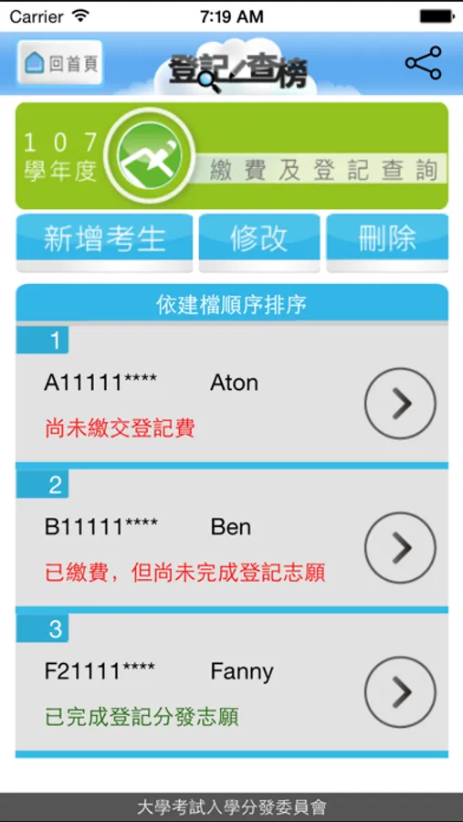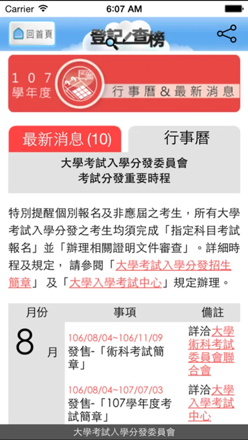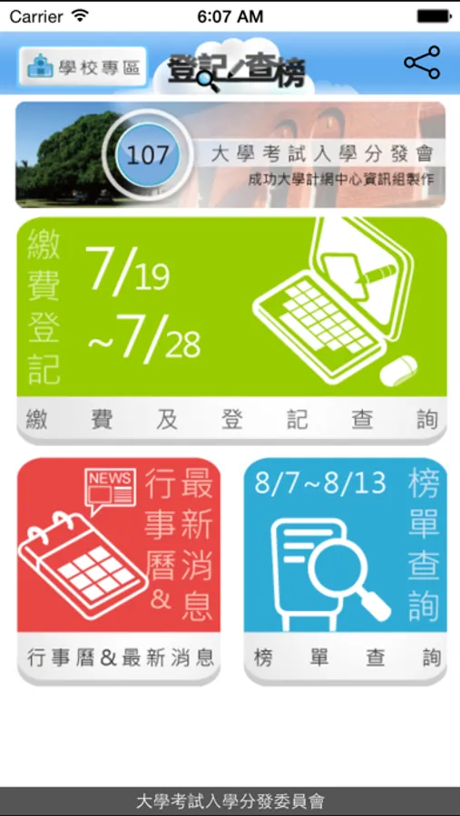 本APP由大學考試入學分發委員會所提供,考生可快速查詢大學考試入學分發相關訊息,內容包含:最新消息、行事曆、繳費及登記查詢及榜單查詢。