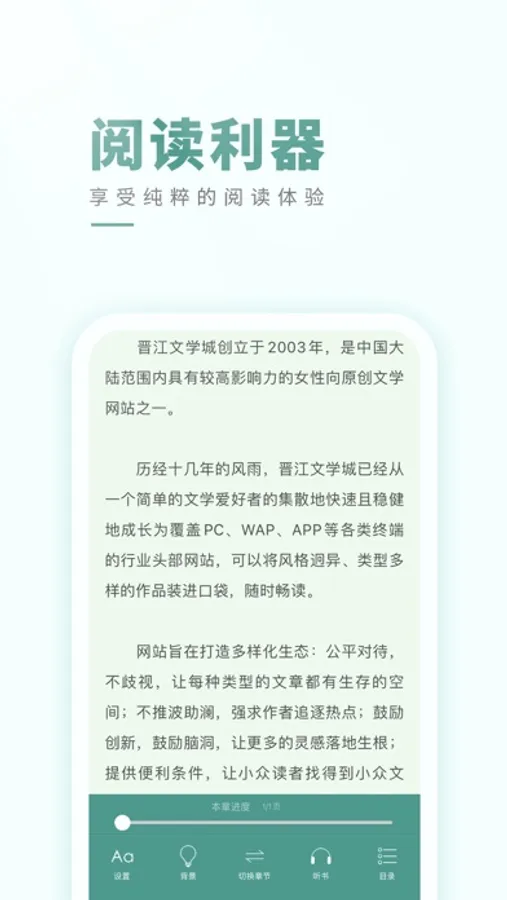 晋江小说阅读是晋江文学城旗下小说阅读器,晋江文学城是女性原创文学网站。小说题材包含:穿越、言情、都市爱情、职场婚姻、青春校园、武侠仙侠、玄幻、网游、悬疑推理、科幻等。网站提供原创作者自主上传写作系统。