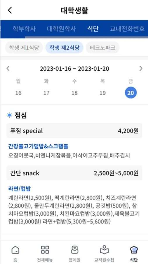 2. 대학생활 : 학사일정, 학부학사, 대학원학사, 식단, 교내전화번호