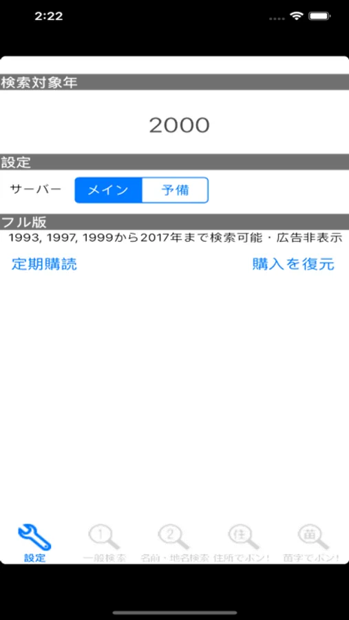 ピッカーから「その他の年」を選択するか、設定から「フル版」をタップして有料版を購読すると、全ての年を検索可能になり、広告が非表示となります。