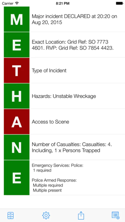Emergency services widely use the METHANE acronym to build a report for alerting others about a major incident. The METHANE format is taught widely, and may seem easy to remember, but in a crisis is often difficult to recall at the very time that it is needed the most. The risk is therefore that the METHANE message is never sent, with subsequent delay in an appropriately-scaled emergency response. Prometheus IMT METHANE aims to be an intuitive, simple, quick and reliable way of building a METHANE message in a major incident situation, or an ETHANE message in a complex incident (i.e. a lower tier of incident where the essential components of the message are still very useful).