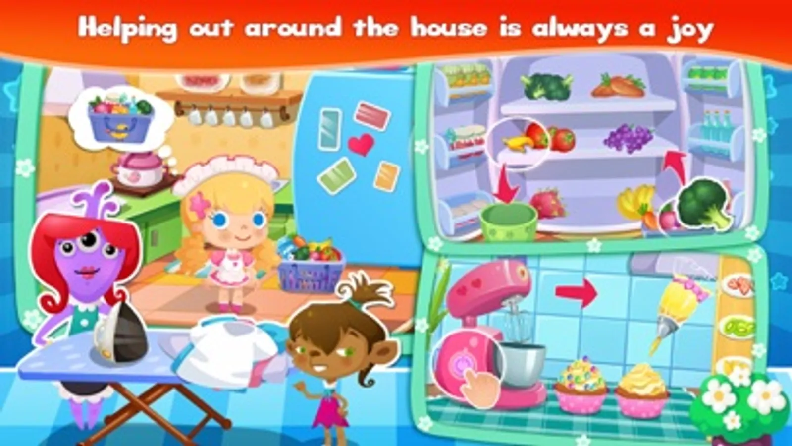 Open the game. Oh, here's our sweetie. Now click her to walk around and meet her family. Tap the bubbles above them to read their minds: make cupcakes, grow flowers, do the laundry…Hmm, see? The dusty fish tank calls for help. Let’s give it a full clean with the brush before changing the water, then drag the pipe to fill some water, after which a tray will pop up with five fine items on it, so you can decorate the tank the way you like to fit your mood. Then, pick your favorite little fish and send it home. Wow, so sweet. Fish says thank you!