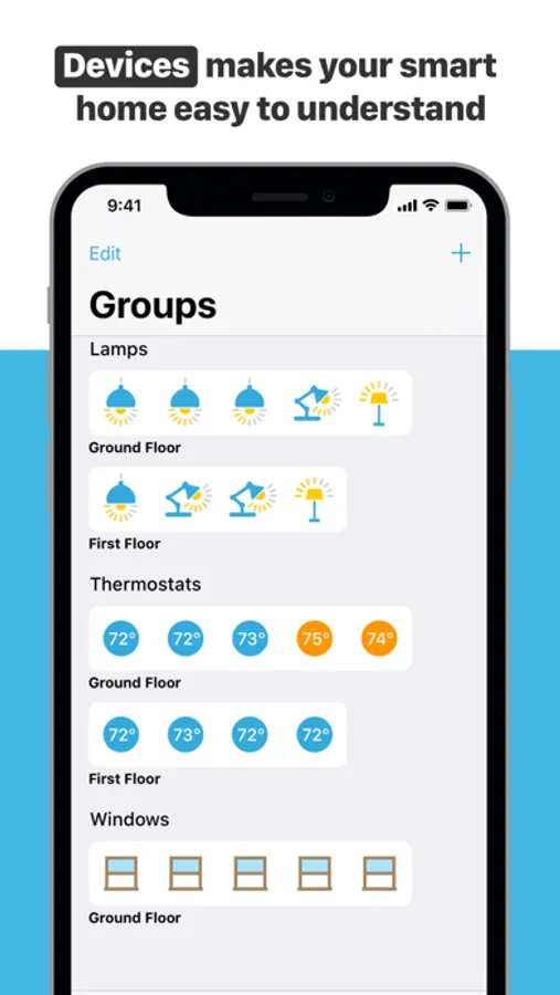 Devices is the Apple HomeKit app that lets you manage and control smart home devices quickly and intuitively. Each device is represented by a specific icon. There is no complicated menu structure – all devices are shown in an overview and can be sorted by room or device type. In addition, the app boasts smart features such as device groups, scenes and triggers.