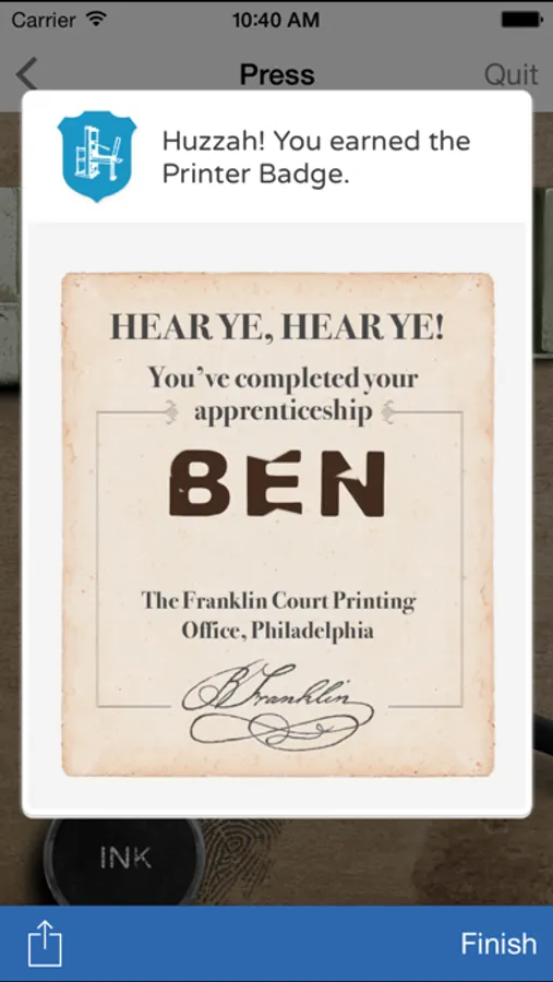 Print on Benjamin Franklin's press - Drag the letters in your name on to the composing stick and then use your finger to coat them with ink. When you're ready, pull the lever to earn your Printer's badge.