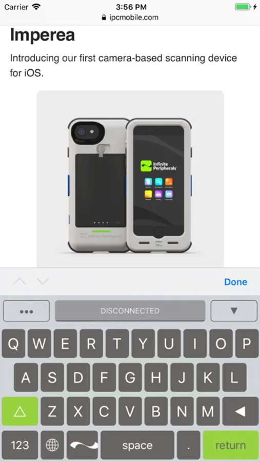 QWedge is a keyboard extension from Infinite Peripherals that allows any iOS application to receive barcodes from Infinite Peripherals' scanners (including the Linea and Infinea product lines). Scanned barcodes will populate into the active text field.