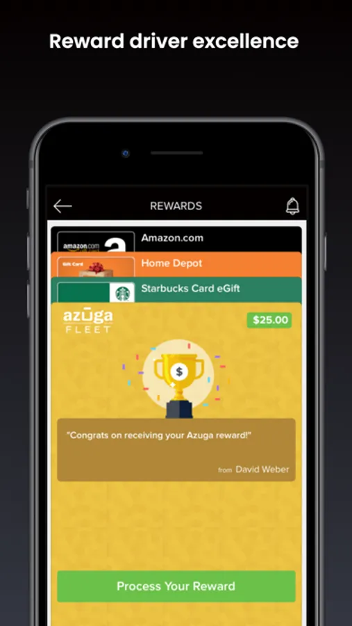 • Reward safe, smart driving. Reward drivers for a job well done behind the wheel. With a tap, managers can send rewards—and drivers receive them—using FleetMobile. Rewards can also be sent via Azuga Fleet.