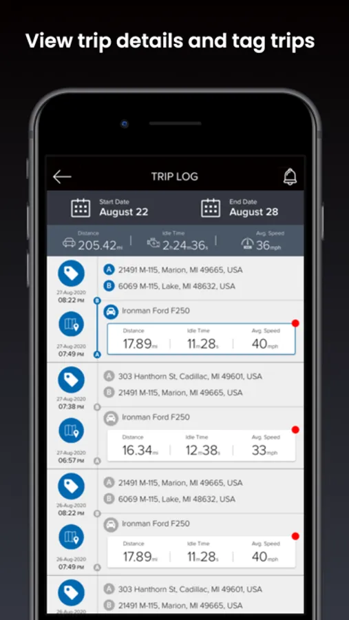 • Log and tag trips. When a driver uses FleetMobile, data is captured from every vehicle he or she drives, creating a comprehensive trip log. Tag trips as business or personal and capture details, including starting point, destination, stops, locations, distance, speed, and idle time.