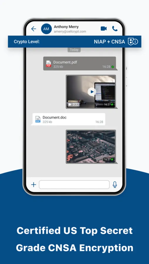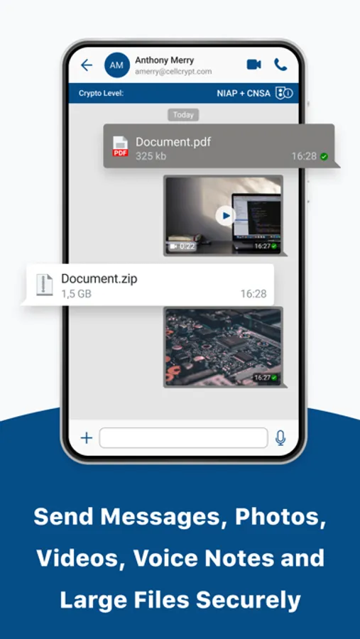 Secure Instant Messaging & File Sharing: Send messages, photos, videos, voice notes, and large files with end-to-end encryption. Cellcrypt's Data at Rest encryption safeguards all stored media and files in the app. Create group chats for seamless collaboration and sharing.