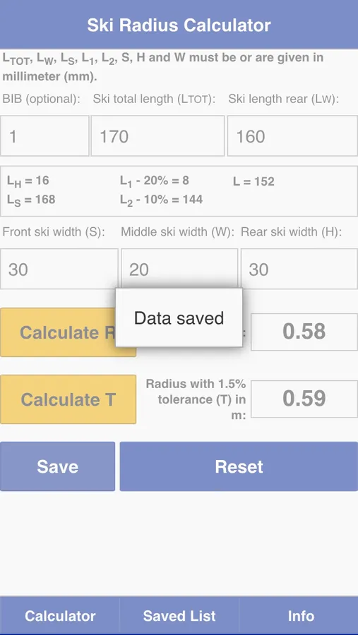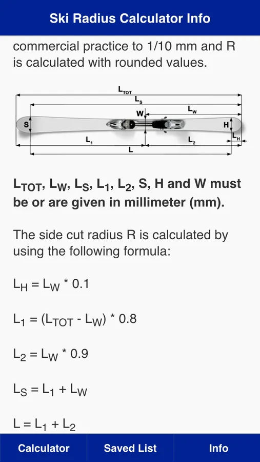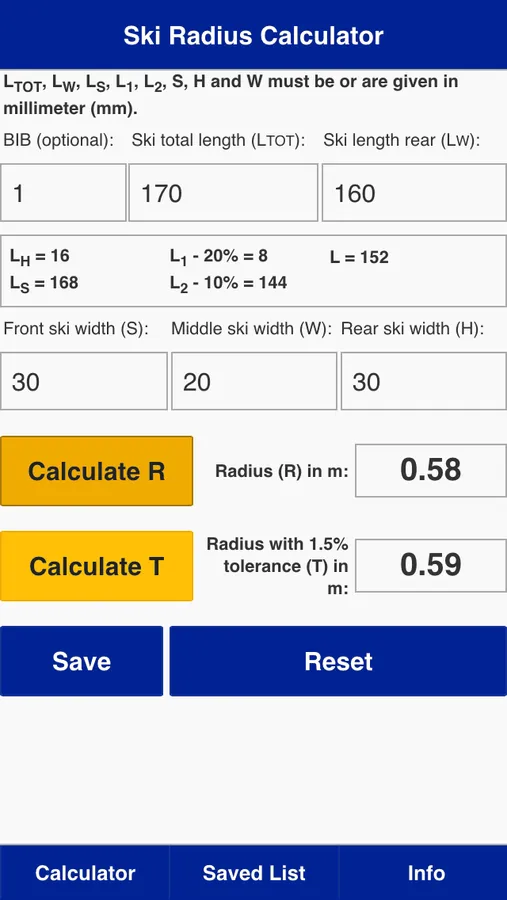 Official FIS Ski Radius Calculator used to determinate ski length and side cut radius allowance according to the FIS rules; using ski total length, rear length, front width, middle width and rear width. The Radius is calculated in meters and can be also calculated with 1.5% tolerance. Once the value is calculated, it can be saved and afterwards emailed to your personal account. There is an information section where parameters and formula are explained.