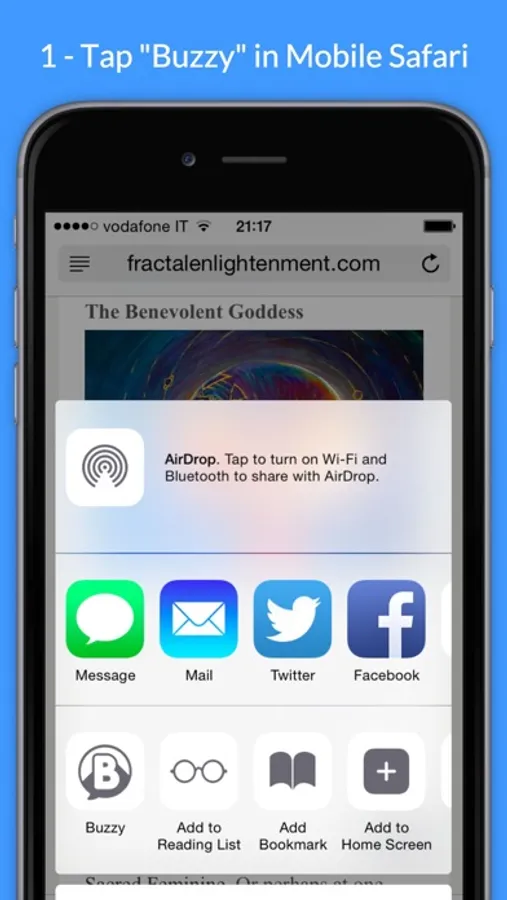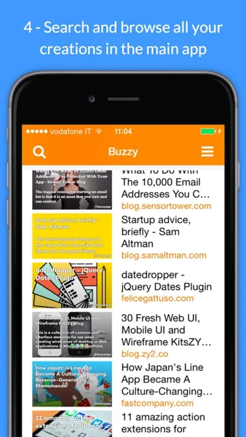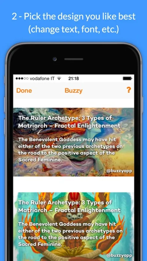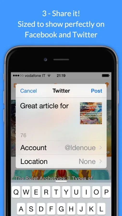 Buzzy extracts images, title and selected text from the web page you read and generates several designs, ready for you to share by email, post on social media (Twitter, Facebook) or simply save them in your photos.