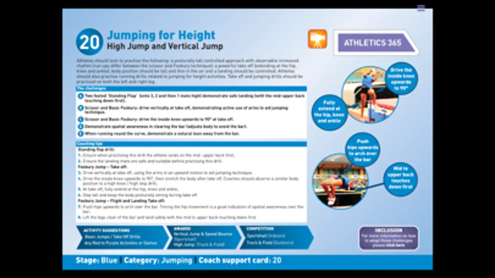 This section of the App explains what the Athletics 365 programme is and how it can be used to maximise your coaching when working with young developing athletes. This section includes a copy of the full Athletics 365 Curriculum for coaches. The Curriculum doubles up as a series of challenges for the athletes to progress through.
