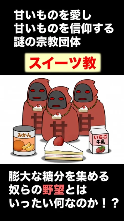 あたりまえですが「スイーツ教」は架空の宗教団体です。