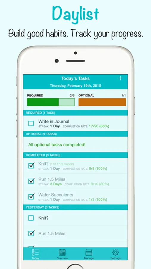 Build good habits, track your progress. Daylist is a powerful, beautiful and intuitive app that keeps track of your daily tasks. Get healthy, get productive, get better at something; whatever it may be, Daylist can help keep you motivated to accomplish your goals.