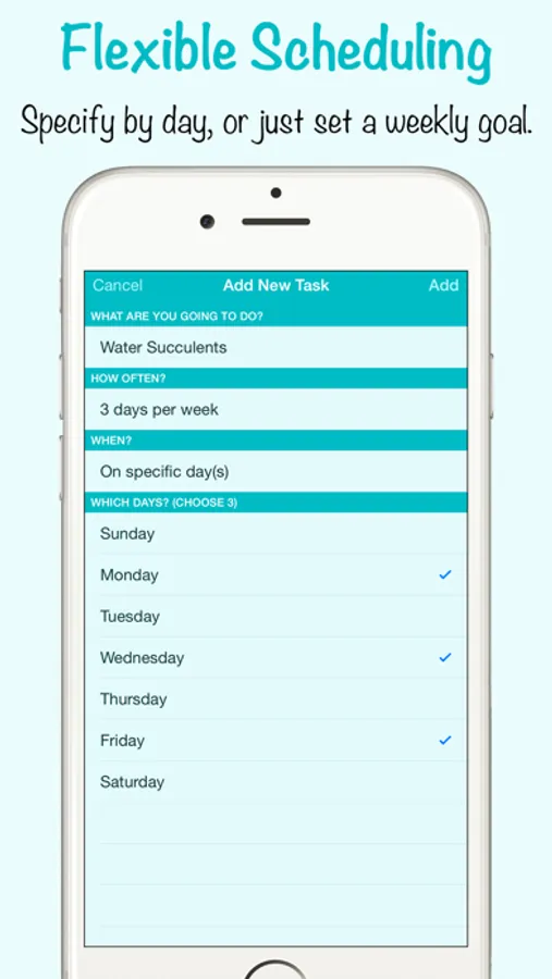 Flexible Scheduling — Schedule tasks as either required (for specific days), or optional (with a goal of completing them a certain number of times per week). Update a task's schedule if its current one is not working for you.
