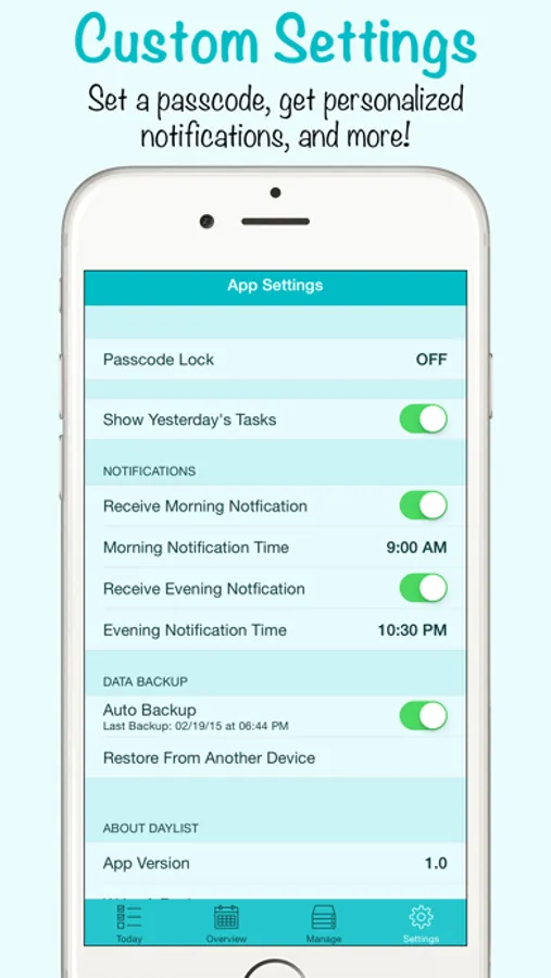 Data Backup — Don't lose your data when you switch to another iPhone, iPad, or iPod Touch. Daylist automatically backs up your data so that you can restore it to another device.