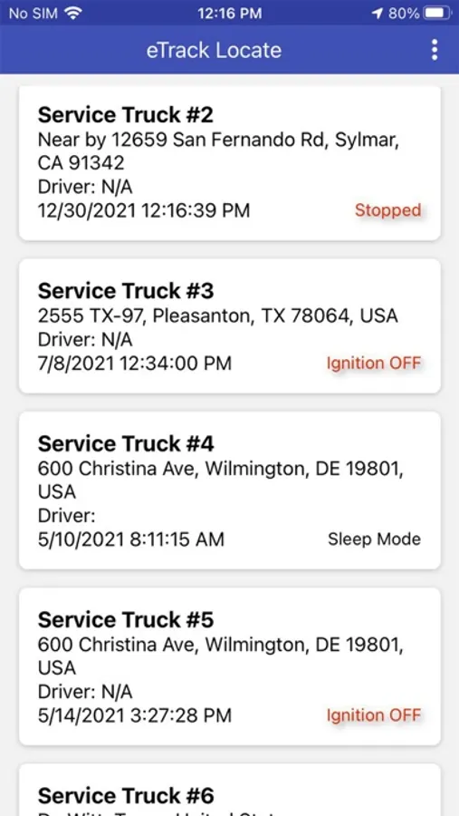 - View in one list all your vehicles along with their last known location, status (Ignition On, Ignition Off,