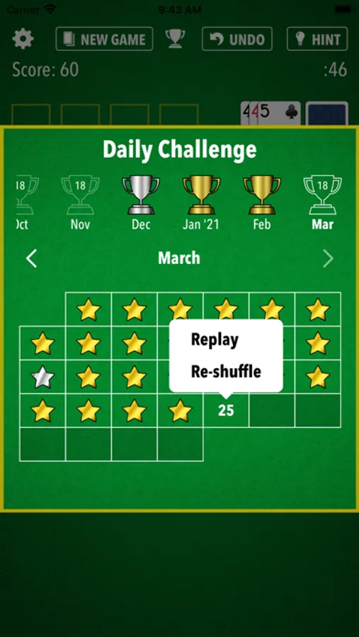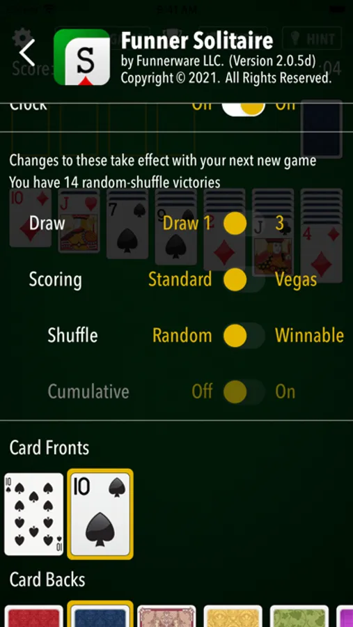 - Now counting your random-shuffle victories (retroactively!). See the count after you win a game, or on the Settings screen (gear icon) near the Shuffle settings. (Only random-shuffle victories are counted, which includes Standard-scoring Random-shuffle games and all Vegas-scoring games.)