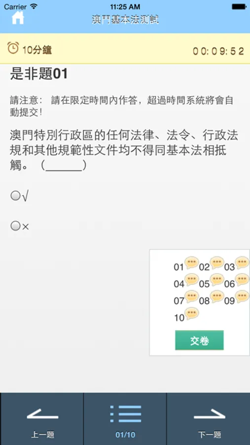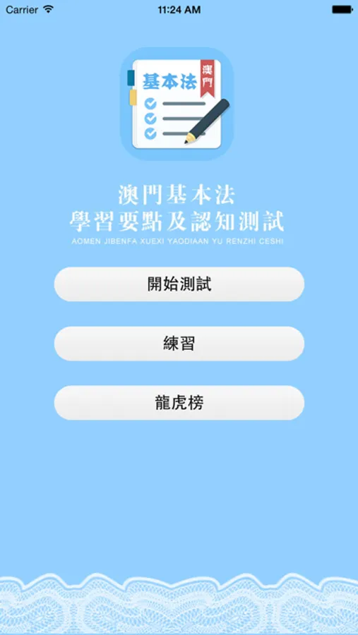“澳門基本法學習與測試”為方便澳門廣大市民和學生學習《澳門基本法》、測試對澳門基本法内容的认知程度而编寫。分練習模式和測試模式两大模块。可供個人學習、政府和社團推廣基本法及學校進行基本法教學之用。 練習模式供用戶根據澳門基本法的章節進行有系统或針對性學習。 測試模式分別設有:初級測試、中級測試及高級測試三種模式,隨機抽樣出題,測試完畢即可知道成績结果。