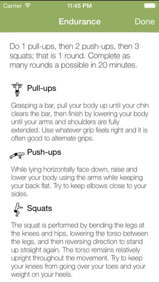 Suggested workout contains basic exercises: pull-ups, push-ups and squats, and a very special scheme. It's split to three different "days". Amounts of pull-ups, push-ups and squats are pre-defined and depend on your current level.