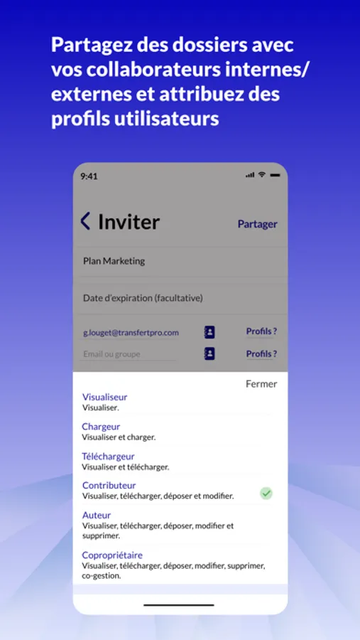- Partagez rapidement des dossiers avec des collaborateurs et attribuez des profils utilisateurs.