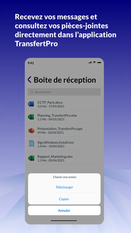 Avec l’application TransfertPro, tous vos fichiers (photos, vidéos, pdf, musiques, documents professionnels…) que vous déposez sur votre espace de stockage dédié, sont sauvegardés en toute sécurité, afin que vous ne perdiez aucune donnée.