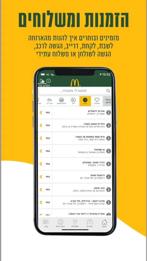 בדרך מטיול בצפון? מחפשים מסעדת מקדונלד'ס קרובה? באפליקציה ניתן לראות את כל המסעדות על-פי הקרבה אליכם, ולבחור את המסעדה באמצעות מגוון מאפיינים כמו: מסעדות שפתוחות עכשיו, כשרות, הגשה לשולחן, משחקייה, נגישות ועוד. ניתן לצפות בפרטים המלאים של המסעדה, כולל שעות פתיחה ומפת הגעה, ולנווט אל המסעדה בלחיצת כפתור. סעו בזהירות :)