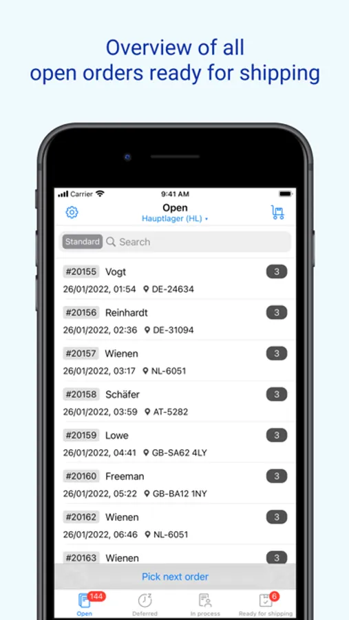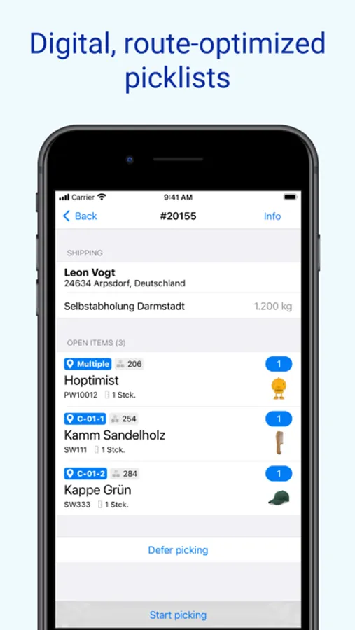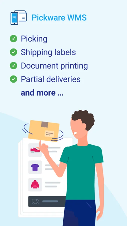 The Pickware WMS Picking app lists all of your ready-to-ship customer orders from your online store and supports you in picking and shipping. The barcode-based, paperless process reduces errors and enables single or multi-level picking, automatic printing of shipping labels and documents, individual pick profiles, partial deliveries and many more.
