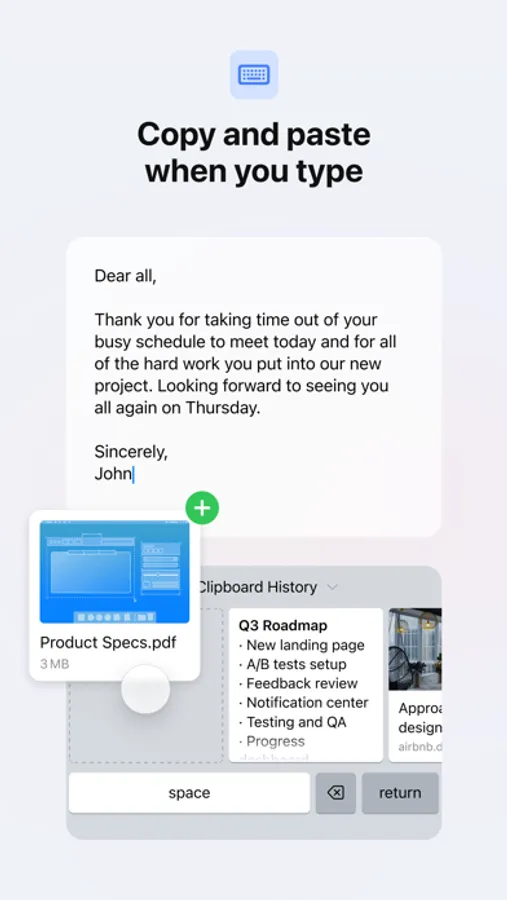 – Scroll through an at-a-glance view of your clipboard featuring large, easy-to-read previews of content so you can find stuff fast.