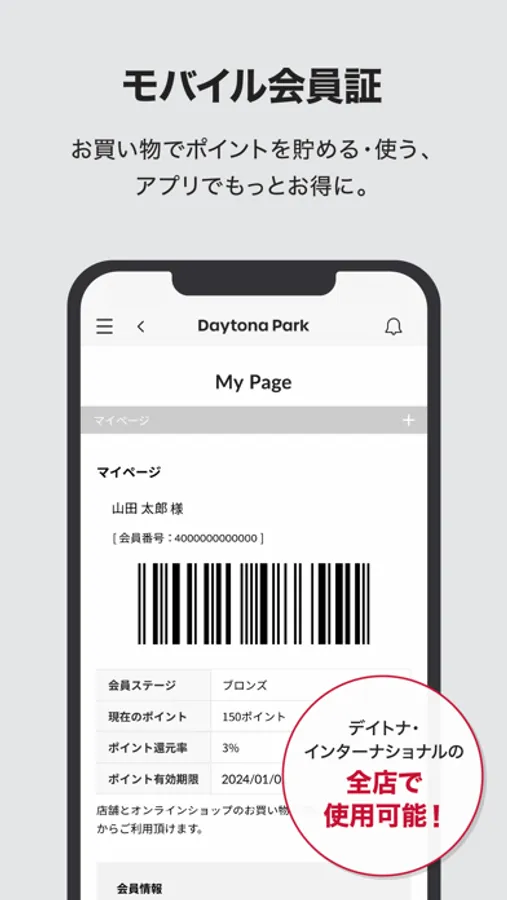 ● 店舗でのお買い物でもマイページのバーコードを提示してポイントを貯められる会員証機能もございます。