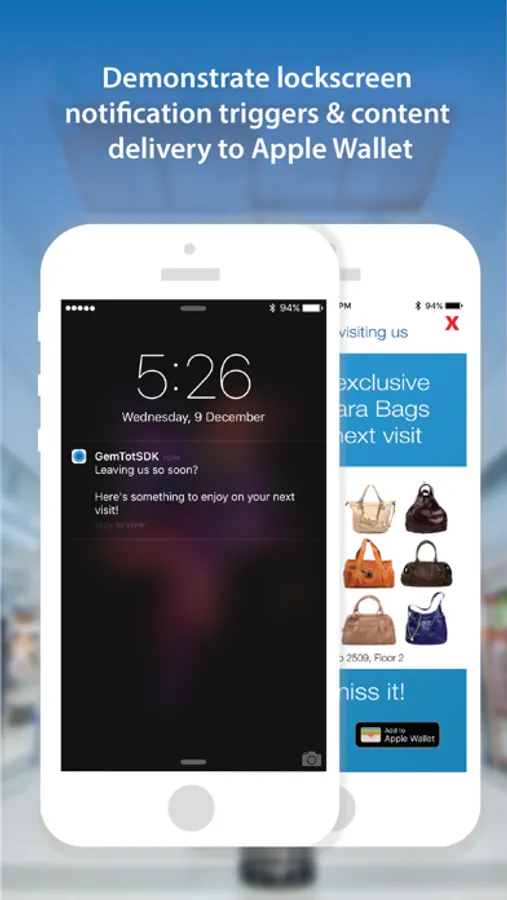 Lock screen demonstration: Demonstrates how entering or exiting a beacon region can trigger a local notification and how a notification could be used to deliver content to Apple Wallet. This demo requires that background location monitoring and local notifications are enabled.