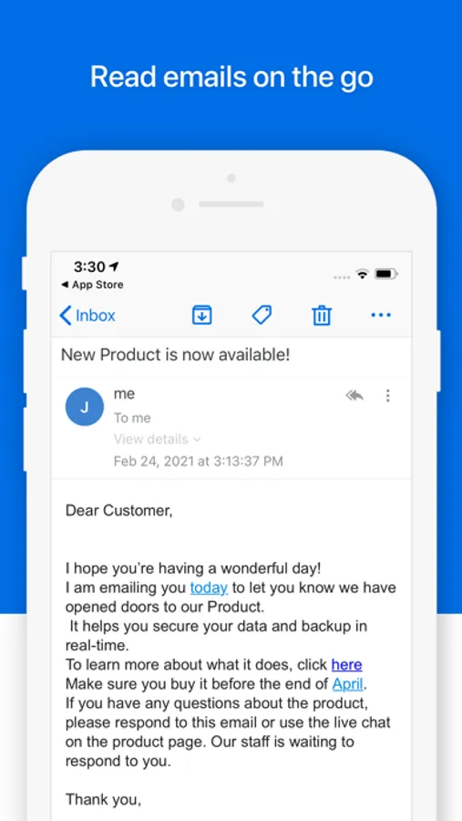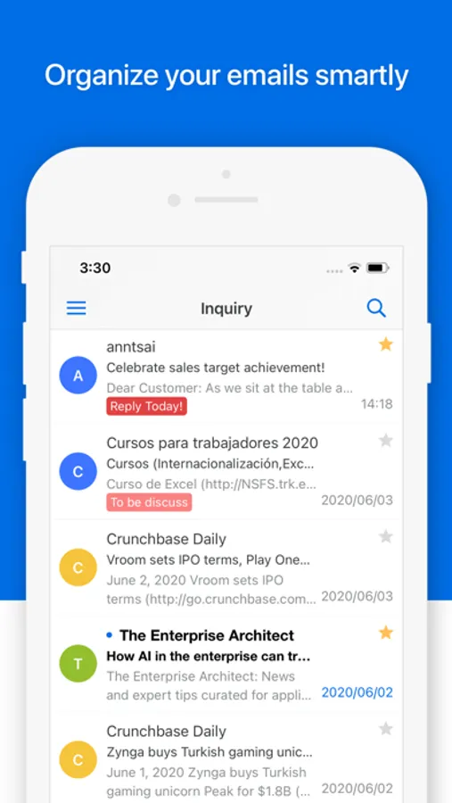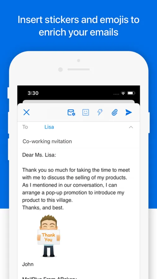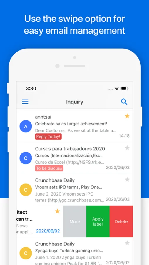 Composing emails or replying to messages on mobile devices can be a hassle. With the intuitive design of MailPlus, you can accomplish more with less effort. Organize your emails right in the palm of your hand. The swipe gestures allow you to quickly apply desired actions to your emails. Quick-reply templates save repeated keystrokes and make your reply even more efficient. With MailPlus, managing emails is only a few taps or swipes away.