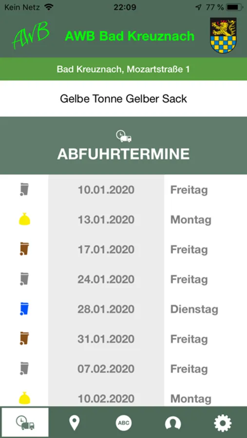 Alle Abfuhrtermine der gewählten Adresse, werden auf der Startseite der App, in chronologischer Reihenfolge angezeigt.
