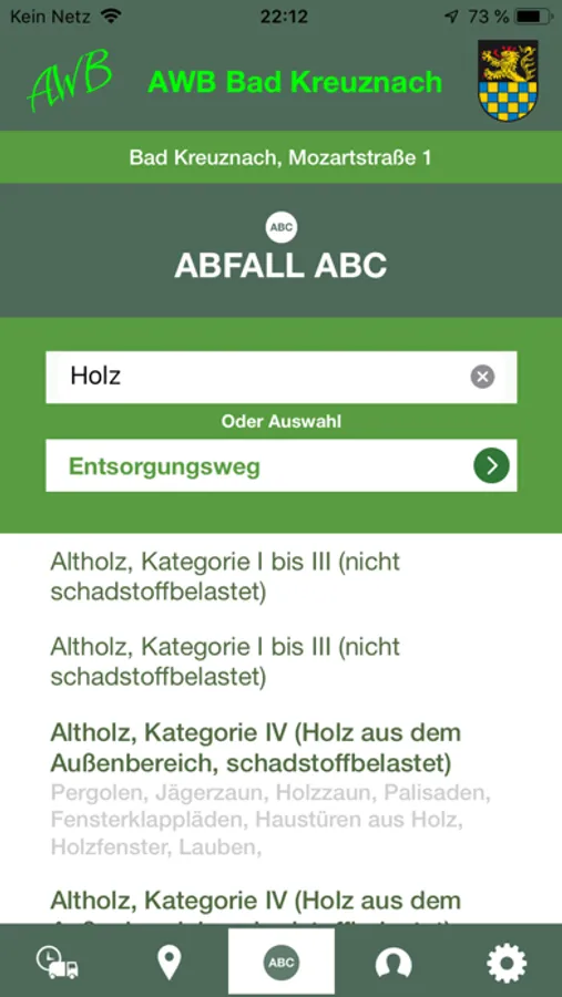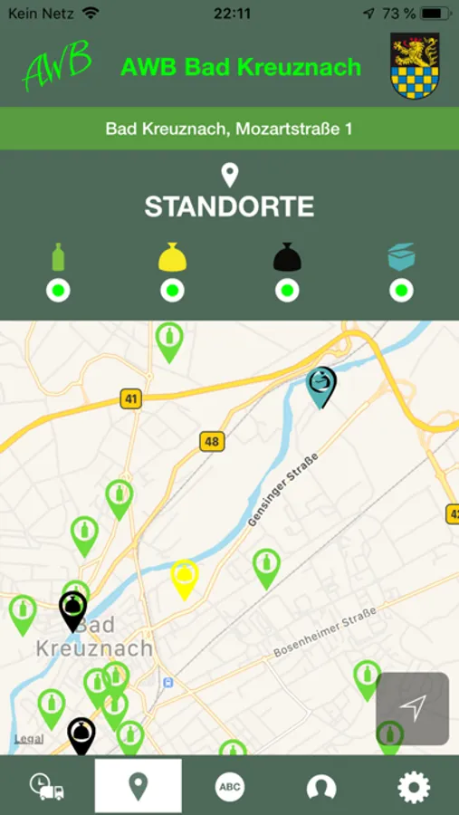 Die Standortsuche hilft bei der Lokalisierung von Wertstoffhöfen, Altglascontainern, Ausgabestellen für gelbe Säcke, oder Verkaufsstellen für zusätzliche Abfallsäcke. Die Positionen der umliegenden Plätze, werden nach Entfernung sortiert angezeigt. Beim Tap auf den jeweiligen Standort, wird dieser inklusive einer Wegbeschreibung auf der Karte dargestellt. Detailinformationen, wie z.B. Öffnungszeiten oder Kontaktmöglichkeiten werden angezeigt.